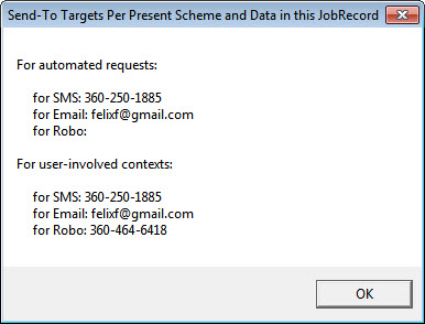 Thus, with the arrangement set as per above, the system would send a SMS if in an applicable JobRecord a SMS target is found (according to such scheme as you've defined and according to such textual arrangement as is in the JobRecord, see here). It would also send a email if similarly finding a suitable email target. If it found either, it not not proceed to the next level. If, however, it found neither, it would then proceed in seeing if the JobRecord (along with the logic of the scheme you selected) offered a RoboCall target. If so, it would then send via RoboCall.