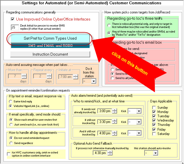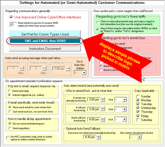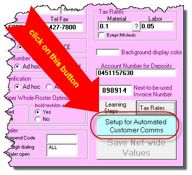 To access this matrix, go to the same larger interface that described in this document's first section. In other words, go into your Settings form (Ctrl-F1), and click on the blue button labeled "Setup for Automated Customer Comms." You'll then see that same larger interface, but now we want you to click on the button shown here: