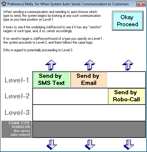 If, contrary to such scheme as is shown above, you wanted all three communication types to go to the extent suitable targets were available in the JobRecord, you'd simply arrange all three communication types in the top level. If you wanted preference for email first, and then SMS, and only RoboCall as a last resort, you'd have email in Level-1, SMS in Level-2, and RoboCall in Level-3.
