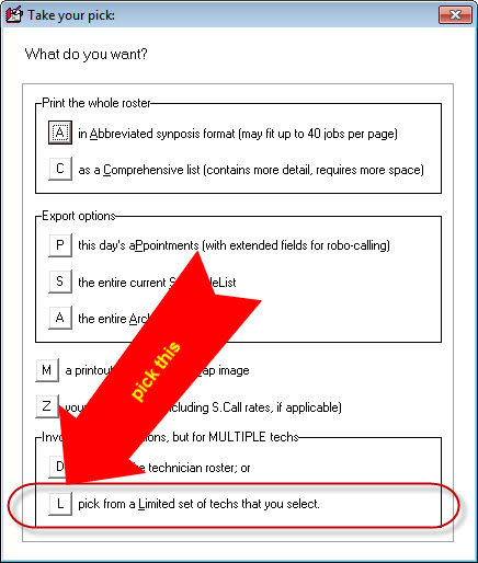 As a second manual method, you may initiate communication sends on all appointments for the selected day as pertain to a particular set of multiple technicians. Initiate this method same as the above (i.e., go first to the desired day's display in the DispatchMap, then hit Alt-P on your keyboard). But, in this case, choose this option in the dialog box: