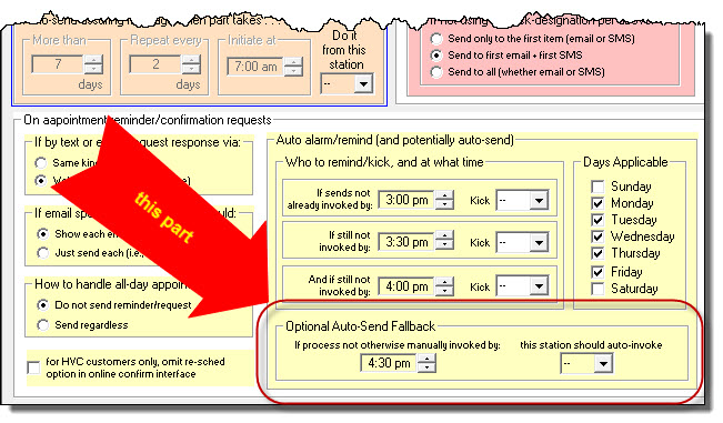 . . . is what you might think of as an emergency fallback. Suppose that by a certain time in the day no one in the operation has initiated sends of appointment-reminder/confirmation requests (i.e., no one has responded to any "kick"). Positively, you don't wan to fail in getting those "sends" out. At this point in day, with no human having done it, there is risk it won't happen at all. Here, in this section, you can set a time of day by which, if the sending process has not already been manually initiated, ServiceDesk will itself auto-initiate, on its own. This assures it gets done, one way or the other.