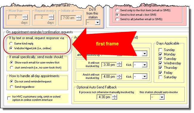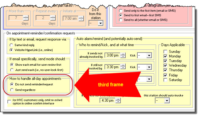 This third frame deals with the question of whether you want appointment-reminder/confirmation-requests to go out on appointments that have not been narrowed to a smaller time-frame than all-day: