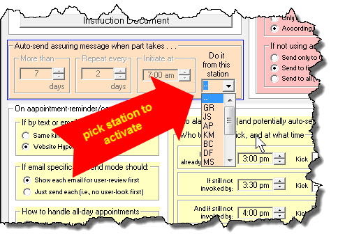 . . . you'll setup for ServiceDesk to "kick" one or more persons, at particular times of the day, with an inquiry asking if it's now a good time to manually initiate sends of appointment-reminder/confirmation-requests. You may setup for a succession of up to three different such "kicks." Each can be set for different persons, or all could be for the same person (with each subsequent kick being akin to the "snooze" function on an alarm clock), or any combination you prefer.