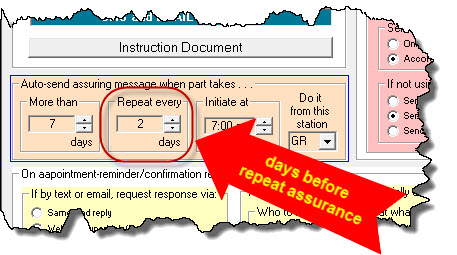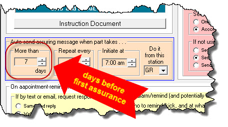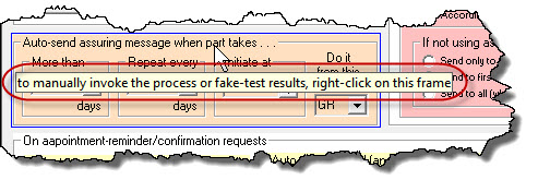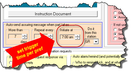 Please note, whereas it's beneficial in the appointment-reminder/confirmation-request context to have human involvement in initiating sends, that is not the case in regard to these "assurance-on-parts" animals. For that reason, we have not similarly setup, in their regard, to normally accommodate human initiation. The intent is for normal operation to be 100 percent automated.