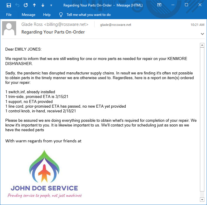 This was initially created in reaction to the COVID-19 pandemic, which produced massive disruption in part supplies. That, in turn, produced a huge burden on service companies in fielding endless inquiries and complaints from customers anxious for repairs that cannot be completed until critical parts arrive.