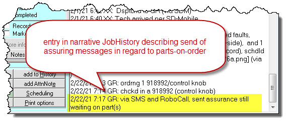 Having a created that structure, we adapted it to several other contexts of sending communication, such as: (a) sending notice to customers when parts arrive (and with optional request to click on a link so as to schedule); (b) sending initial requests to schedule on jobs dispatched by third parties; and (c) in the SD-Mobile context, when the tech wants to send an "I am on my way" communication (aka "tech call-aheads").