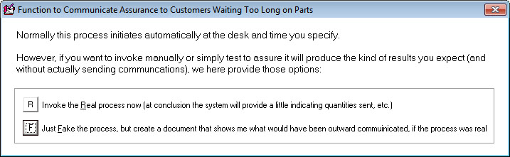 Regardless, we realize there may be an odd occasion where you wish to manually initiate (maybe the automatic process did not occur, for example, because ServiceDesk was not running in the designated station at the designated time). Likewise, it's possible you may want to a test to see what the communications would be, without actually sending them. We've accommodated for both needs. But, because we think these are somewhat obscure needs, we've made the path to accommodation likewise somewhat obscure. Regardless, if you float your mousepointer over the frame portion of that peach-colored frame, you'll see a ToolTip, like this: